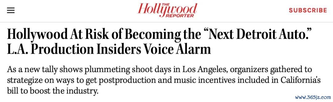 △《好莱坞报道者》发表题为《好莱坞或成为下一个底特律》的文章,指出好莱坞最后可能只剩一具空壳。
