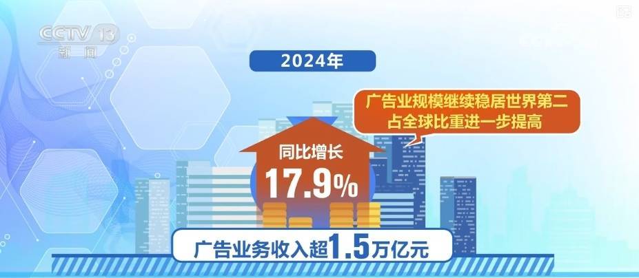 发布会上介绍,2024年,广告业务收入超1.5万亿元,同比增长17.9%,广告业规模继续稳居世界第二,占全球比重进一步提高。在全国范围内,24个省(区、市)收入实现同比上涨,15个省份广告业收入超百亿元。